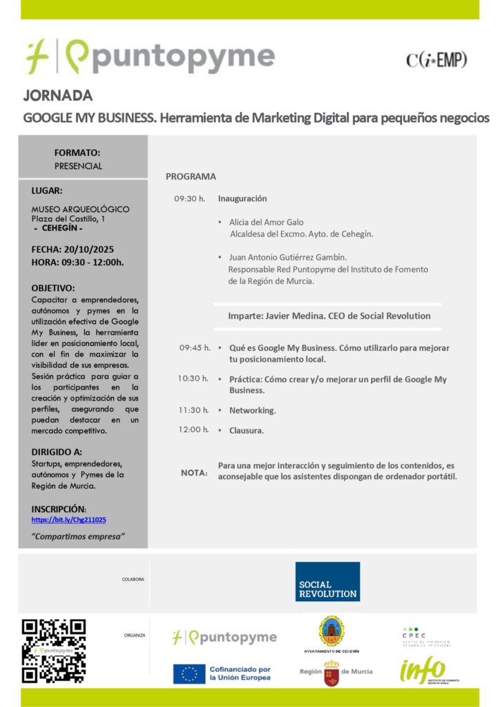 El pasado 20 de octubre tuvo lugar en el museo arqueológico de Cehegín un taller práctico sobre la herramienta gratuita Google My Business, la cual es líder en posicionamiento local, que permite a los negocios mostrar toda su información a los clientes, geolocalizar su establecimiento, mostrar horarios de apertura, administrar las reseñas y gestionar las reservas. El objetivo es el de maximizar la visibilidad de las empresas en la web para atraer a nueva clientela y hacerlas más competitivas.